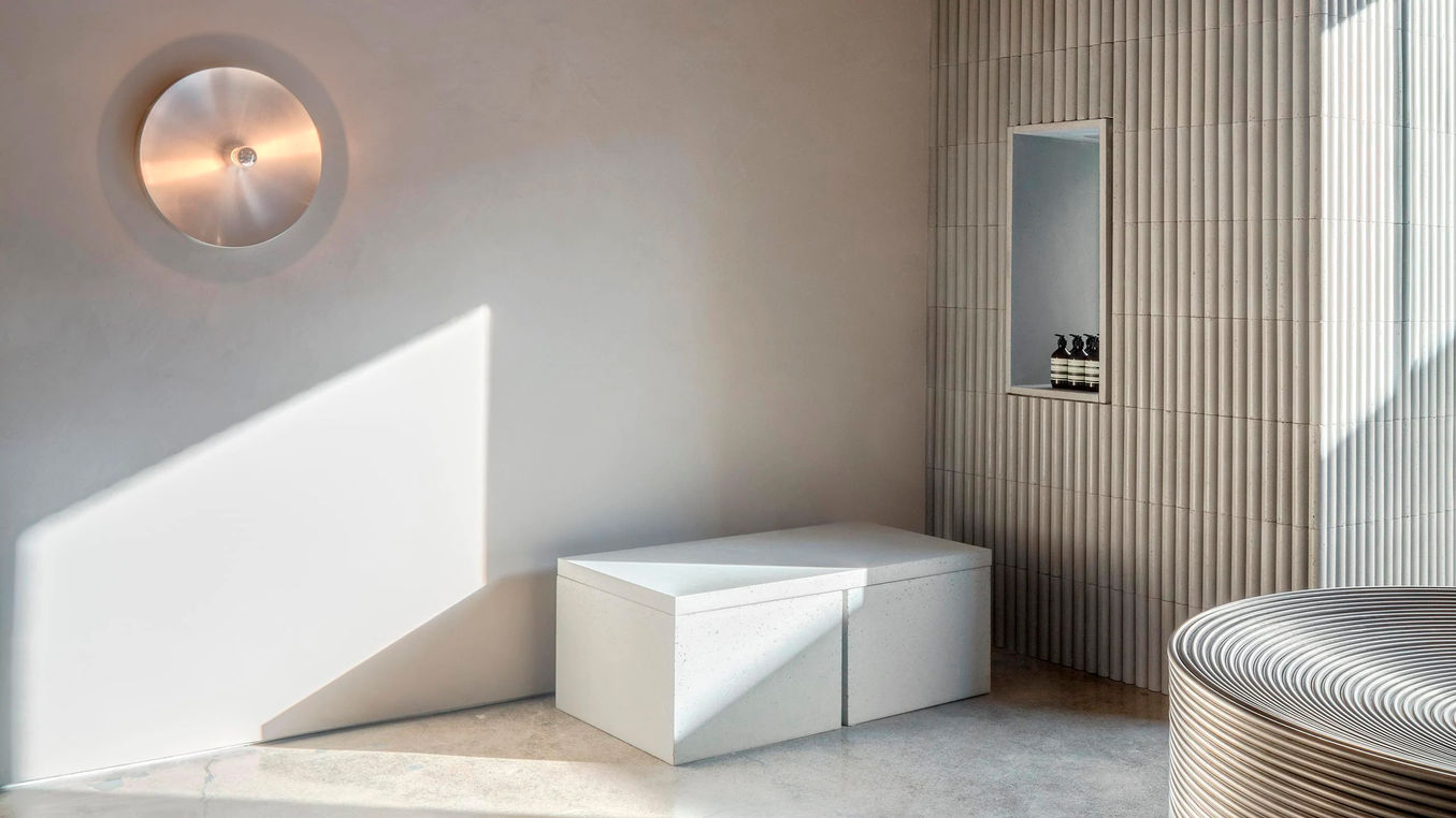 The physical features of the local Mount Tamalpais are the underlying foundation for this calming oasis that provides a soft embrace for its visitors. The masterpiece custom wash basin is the center of attention in this fluted concrete clad space.